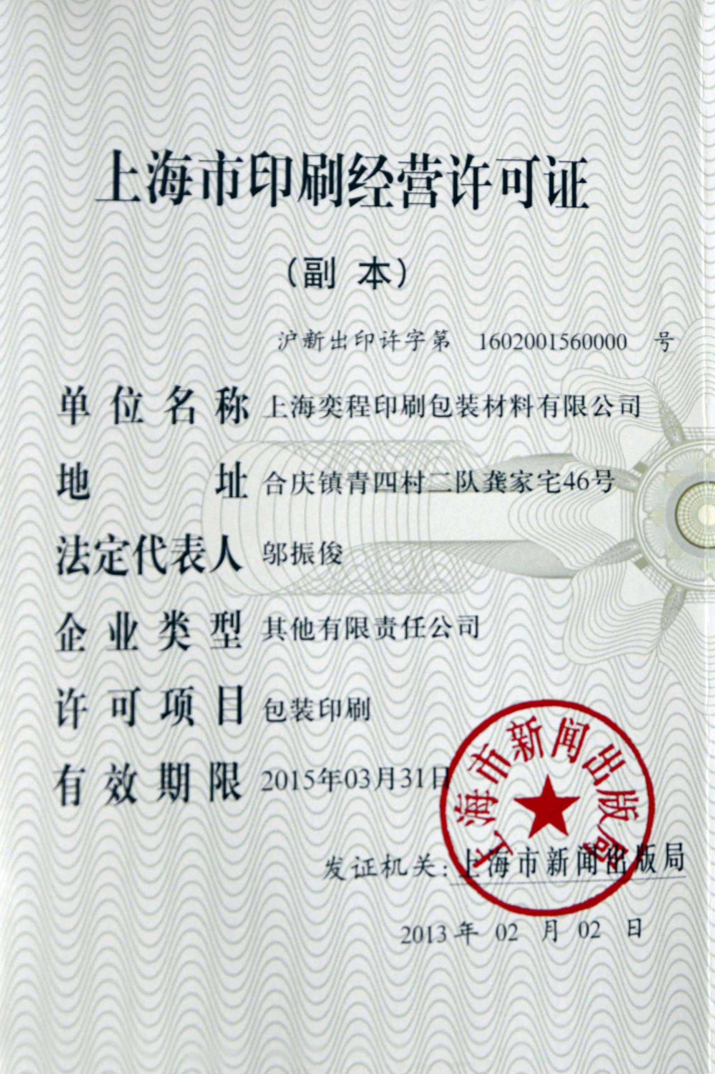 上海奕程印刷包裝材料有限公司 地址:上海浦東新區(qū)華夏東路4220號